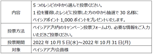 株式会社ベイシア(本社:群馬県前橋市、代表取締役社長:相木孝仁)は、10月5日(水)~10月31日(月)の期間に、ベイシアアプリ内でハロウィンにおすすめのベイシアオリジナルレシピ人気投票キャンペーンを実施いたしました。たくさんのご投票をいただき、誠にありがとうございました。