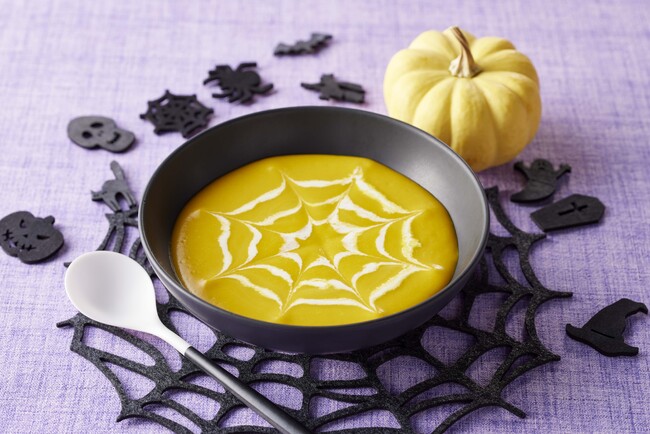 ベイシア人気商品「幻のかぼちゃ」「別海のおいしい牛乳」を使用したパンプキンスープ。蜘蛛の巣アートも楽しめるレシピです。