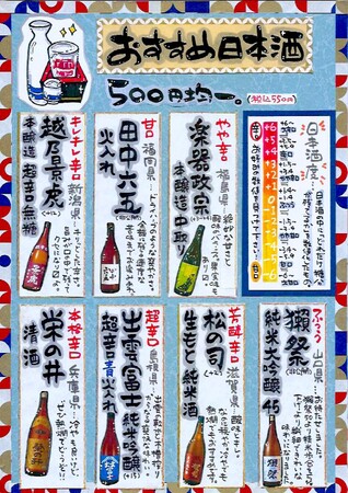 さらに日本各地のおすすめ銘柄焼酎、日本酒が全品一律500円(税抜き)で楽しめます。