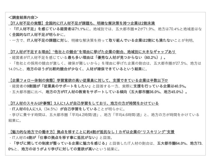 「企業のサポートがなくても積極的にITスキルの学習をしたい」と考えるIT人材に地域差はなく、経営者が求める「向上心があり」「学習意欲の高い」人材は全国に存在しています。また、今回の調査結果から、IT人材は生活の拠点を移すことに比較的抵抗がない一方で、地方で働く際のスキルアップのサポートを望んでいることが分かりました。