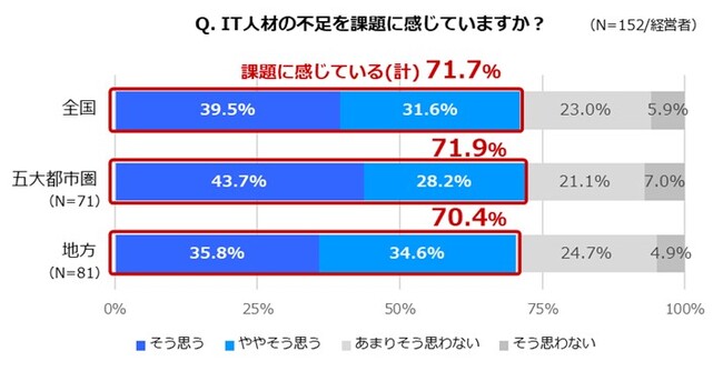 さらに、『IT人材の不足を課題に感じているか』を尋ねたところ、71.7%(そう思う39.5%、ややそう思う31.6%)の経営者が「課題に感じている」と回答。内訳を地域別にみると、五大都市圏は71.9%(そう思う43.7%、ややそう思う28.2%)、地方は70.4%(そう思う35.8%、ややそう思う34.6%)となり、全国的にIT人材が不足している実情が明らかになりました。
