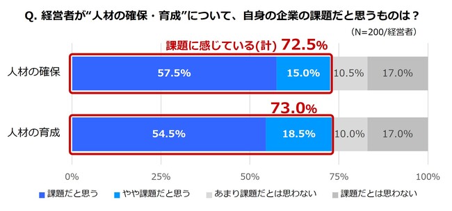 経営者に対し、『“人材の確保・育成”について、あなたの企業の課題だと思うもの』を尋ねたところ、「人材の確保」と回答したのは72.5%(課題だと思う57.5%、やや課題だと思う15.0%)、「人材の育成」と回答したのは73.0%(課題だと思う54.5%、やや課題だと思う18.5%)が「課題に感じている」となりました。