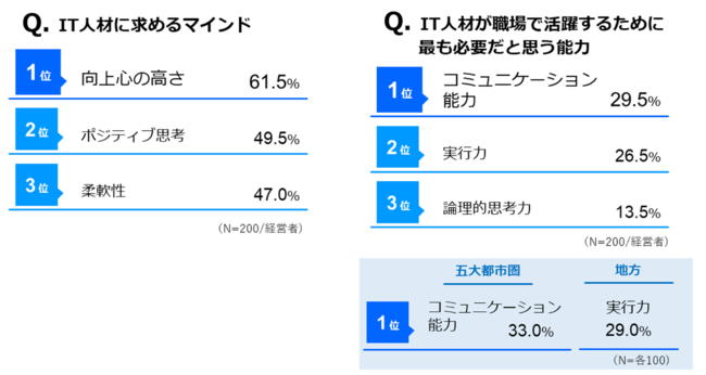 続けて、経営者全体に対し、『IT人材に求めるマインド』を尋ねたところ、1位「向上心の高さ(61.5%)」、2位「ポジティブ思考(49.5%)」、3位「柔軟性(47.0%)」が挙がりました。また、『IT人材が職場で活躍するために最も必要だと思う能力』を尋ねたところ、全体では、1位「コミュニケーション能力(29.5%)」、2位「実行力(26.5%)」、3位「論理的思考力(13.5%)」となった一方、地域別では、五大都市圏は「コミュニケーション能力(33.0%)」、地方では「実行力(29.0%)」が1位となりました。