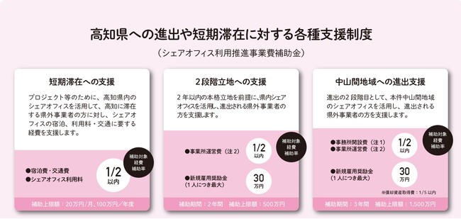 また、高知県で短期滞在する際の宿泊交通費や、2年以内にオフィスビルに移転し、雇用を拡大(2段階立地)することを前提に県内シェアオフィスでスモールスタートする際の運営費等を支援する制度を用意しています。