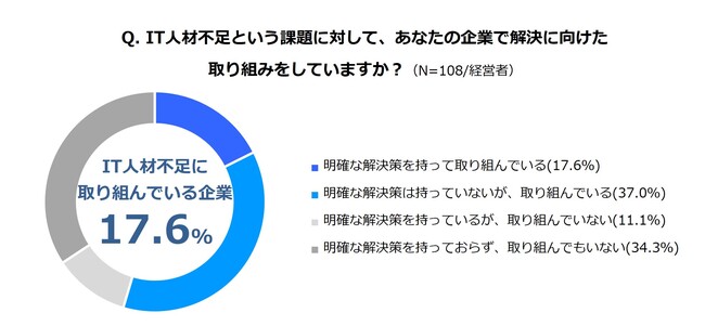 前問で「IT人材の不足に課題を抱えている」と回答した経営者を対象に、『IT人材不足という課題に対して、あなたの企業で解決に向けた取り組みをしているか』を尋ねたところ、「明確な解決策を持って取り組んでいる」と回答した経営者はわずか17.6%に留まりました。