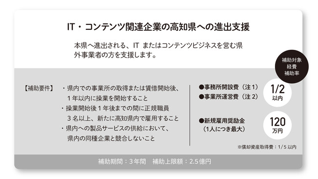 IT・コンテンツ関連企業が高知県内に拠点設立する際に、操業開始から1年以内に3名の正社員を雇用することを要件に、補助期間3年間(36か月)、補助額最大2.5億円の立地支援制度を用意しています。