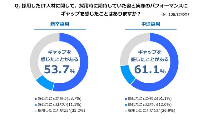 『採用したIT人材に関して、採用時に期待していた姿と実際のパフォーマンスにギャップを感じたことはあるか』を尋ねたところ、新卒採用では53.7%、中途採用では61.1%が「ギャップを感じたことがある」と回答しました。