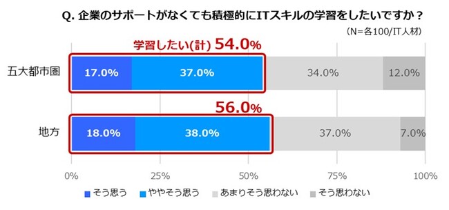 『企業のサポートがなくても積極的にITスキルの学習をしたいか』を尋ねたところ、五大都市圏は54.0%(そう思う17.0%、ややそう思う37.0%)、地方は56.0%(そう思う18.0%、ややそう思う38.0%)が「学習をしたい」と回答しました。また、『ITスキル学習のために補助制度を整っている企業に魅力を感じるか』を尋ねたところ、五大都市圏は64.0%(感じる26.0%、やや感じる38.0%)、地方は73.0%(感じる25.0%、やや感じる48.0%)が「魅力を感じる」と回答し、ともに地方の方が高い結果となりました。