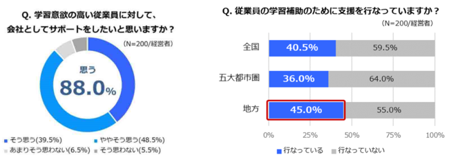 一方で、『従業員の学習補助のために支援を行なっているか』を尋ねたところ、「行っている」と回答した経営者は「40.5%」で半数を切る形に。地域別では、五大都市圏36.0%、地方45.0%となり、地方の方が支援を行っている割合がやや高い結果となりました。