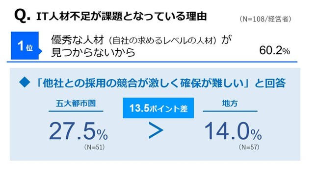 ・経営者がIT人材不足と感じている最も多い理由は「優秀な人材が見つからない(60.2%)」。一方、地方の方が、比較的競合が少なく人材を獲得できていることが判明。