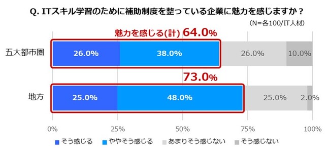 ・五大都市圏64.0%、地方73.0%のIT人材が「学びに関しての制度が整っている企業に魅力を感じる」と回答。