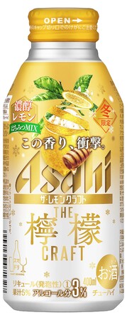 『アサヒ ザ・レモンクラフト 期間限定 濃醇レモンはちみつMIX』は5種のレモン素材とはちみつを使用したプレミアムチューハイです。レモン素材は果実の複雑な味わいを残したレモン果汁・レモンオイル・旬果レモンスピリッツ・凍結レモンピールエキス・瀬戸内産レモンエキスを使用しました。“はちみつの王様”と呼ばれる、レンゲの花からとれるはちみつを使用することで、濃醇な味わいを実現しました。「アサヒ ザ・レモンクラフト」ブランドでは初めてのアルコール分3%の商品で、アルコール分の低い商品を好むお客さまにもお楽しみいただけます。パッケージは缶体中央にレモンとはちみつのイラストを描くことで商品の特長を分かりやすく訴求しています。冬限定のアイコンと雪の結晶のイラストで季節感を演出しました。