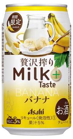 『アサヒ 贅沢搾り期間限定ミルクテイストプラスバナナ』は、バナナ果汁を5%使用した、ジューススタンドのバナナミルクのような味わいを表現したチューハイです。「贅沢搾りプラス」シリーズは「贅沢搾り」の果実感を楽しみたいお客さまに“たっぷり果実で、ほんのりよえる。贅沢チューハイ”のコンセプトはそのままに、果物と相性の良いものを組み合わせることで、果物好きのお客さまに向けて“果物を使用した新しいお酒の楽しみ方”を提案するシリーズです。「贅沢搾り」ブランドでは初めてのアルコール分3%の商品で、アルコール分の低い商品を求めているお客さまにもお楽しみいただけます。パッケージはバナナのイラストに加え「Milk Taste+」と記載することで、商品特長を分かりやすく訴求しています。