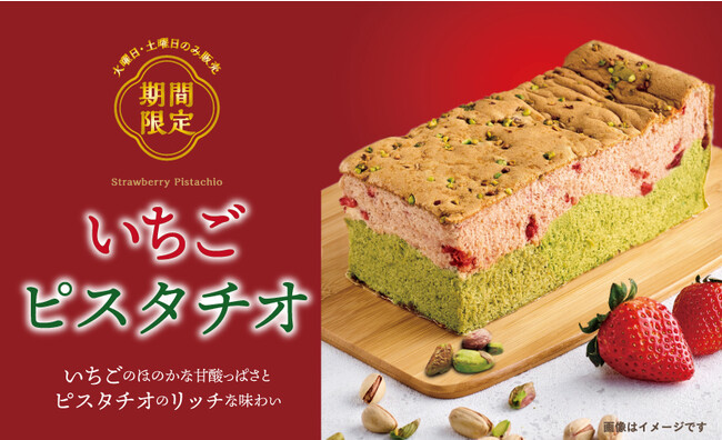 いちごの果肉を感じていただけるいちご生地とピスタチオペーストを練りこんだ生地を2層にした『いちごピスタチオ』さらに、ローストされたクラッシュピスタチオの香ばしさと食感をお楽しみください。