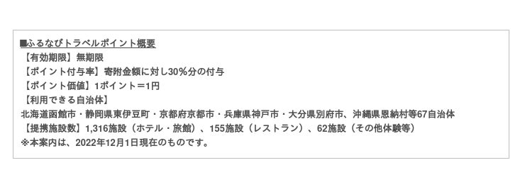 ふるさと納税先にある提携ホテル・旅館で利用可能な、無期限の電子ポイント(トラベルポイント)が返礼品として付与される、初めての方にも判りやすいふるさと納税サービスです。