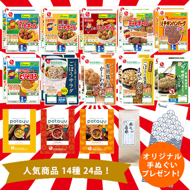 ロングセラー「イシイのおべんとクンミートボール」や、11 月に発売した冬の人気ハンバーグ「千葉市原市の姉崎 だいこんおろしソースハンバーグ」など 14 種 24 品を詰め込みました。