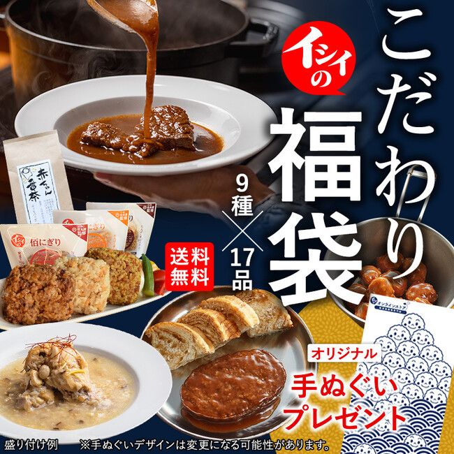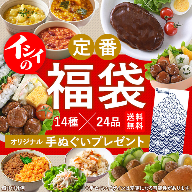 新しい年を迎えるにあたり、みなさまのおうちでの過ごし方や関心ごとを考え、普段使いやすいロングセラーの 「イシイのおべんとクン ミートボール」、家族みんなで楽しめるこの秋発売した新商品の「ビーフシチューベース」など 人気商品を揃え、今年は2種類の福袋をご用意しました。さらにイシイの人気キャラクター『ミート君』のオリジナ ル手ぬぐいや、次回使える「500 円クーポン」付きとなります。 今後も多くのみなさまに楽しんでいただける商品や楽しい思い出をお届けしてまいります。「無添加調理 イシ イの福袋 2023」で素敵な新年をお過ごしください。