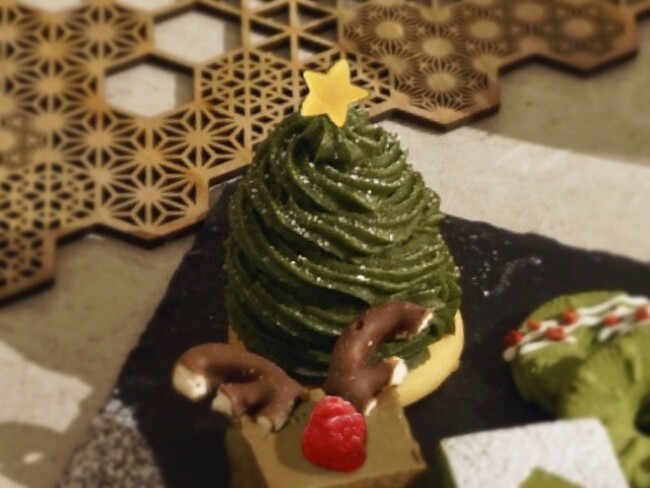 クリスマスツリーの形をしたモンブランの中には真っ赤な苺。中と外で二度楽しめる抹茶モンブランです。