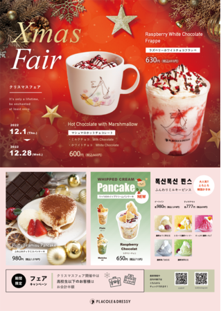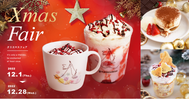 『個性が煌めく魔法の言葉』 "100人の人生に100通りに煌めく魔法をかける"をテーマに創設された古都鎌倉発のラグジュアリーブランド、PLACOLE&DRESSY(プラコレ&ドレシー)がプロデュースするカフェ&バー、『お花とドレスと紅茶のお店 DRESSY ROOM&Tea』が、12月1ヶ月間は期間限定「クリスマスフェア」を開催いたします。ホリデーを満喫できるお洒落で美味しいメニューを限定販売!寒い冬にぴったりな『濃厚チョコレートドリンク』や大人のクリスマスを堪能できる『ティラミスパンケーキ』を限定販売!温かい店内でごゆっくりお過ごしください。
