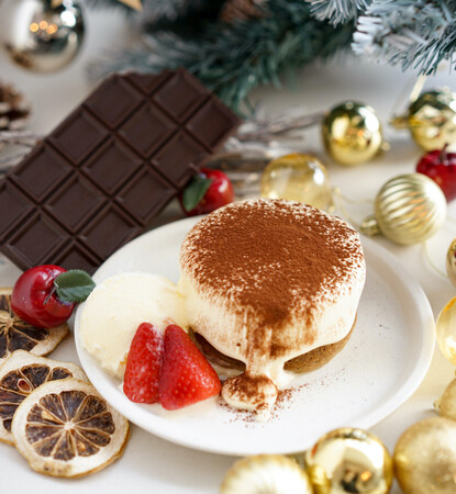 コーヒーソースを浸み込ませたパンケーキと濃厚なマスカルポーネチーズのクリームが2層になっているティラミス仕立てのパンケーキ。とろとろのマスカルポーネクリームがとろ~りと広がる瞬間が見た目にも楽しく、マスカルポーネのコクと、ココアパウダーのほろ苦さが口いっぱいに広がる大人の味のパンケーキに仕上がりました。