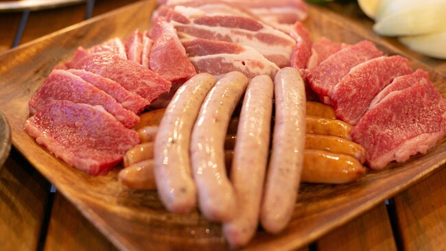 BBQには、牛、豚、ウインナーの盛り合わせをご用意! その他、サラダやデザートもプランに付いています。