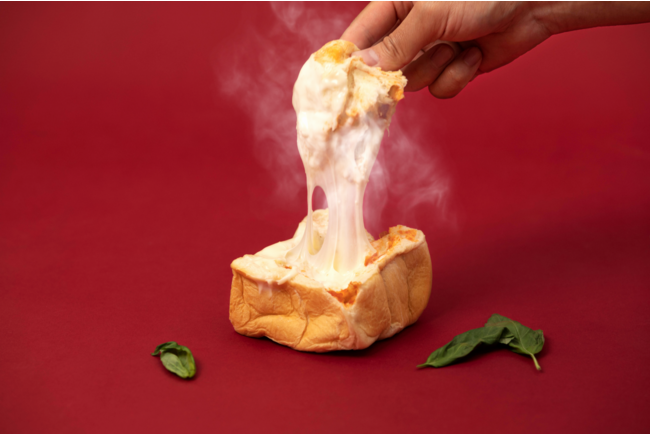「STEAM BREAD PIZZA FONDUE」は、しっとりもっちりしたオリジナルのパン生地に、トマトや玉ねぎをベースとしたピザソースを織り込み、ナポリピザのような食感を再現。そこにモッツァレラを主体としたチーズを100gたっぷり合わせ、レンジで温めると中からチーズがとろけ出す、ビジュアルも食べ方も楽しめる“シェアできる”新たな食パンの形を提案します。