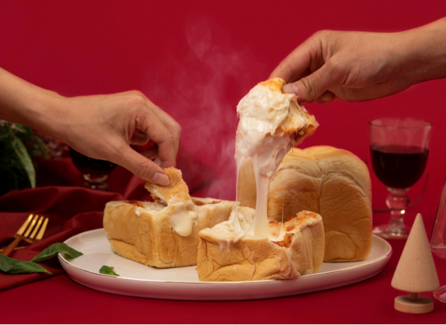 激動の2022年を振り返り、「食パンをシェアしながらみんなで楽しむ喜び」をお届けしたいという想いから、新しいスチーム食パンの魅力を追求しました。ワクワクを掻き立てる、オリジナルBOXも制作しました。今にもとろけ出しそうなチーズが入った食パンを皆で囲い、アッと驚くようなビジュアルを楽しんでいただけます。