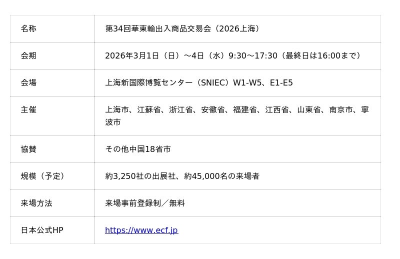 「第34回中国華東輸出入商品交易会」(略称:華交会)は、EAST CHINA随一の規模を誇る消費財見本市です。上海新国際博覧センターに 2026年3月1日(日)から4日(水)の4日間開催します。