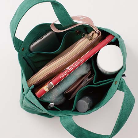 ランチタイムやワンマイルの外出など、デイリーに使える8ポケットバッグを中心としたセット。バッグの色は、2023年のトレンドカラーと予想されているヴァーディグリス(グリーン)。バッグに収まるB6サイズの多機能ポーチもついてきます。