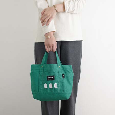限定カラーのグリーンで仕立てたオリジナルバッグ。前面には、幸福の象徴とされるフクロウをキッピスオリジナルデザインであしらっています。