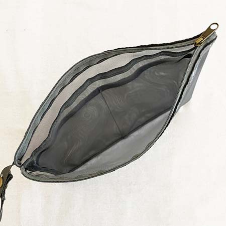A5サイズで間仕切りつき、内ポケット2つを装備。濡れても水分を拭き取れる素材を採用。ループがついているため手持ちしやすく、バッグに取りつけて貴重品入れとして使っても便利です。