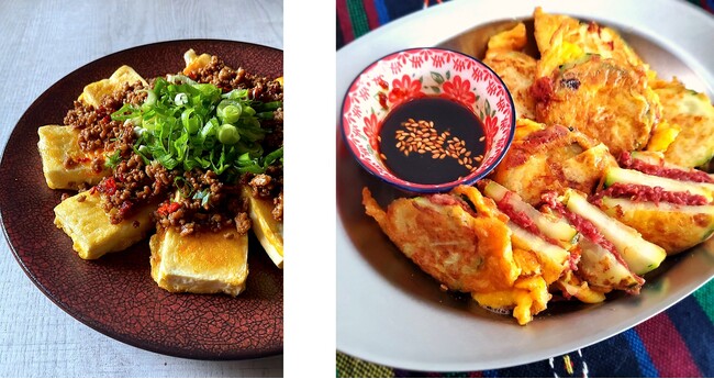 左:豆腐のジョン黒酢ひき肉餡掛け(https://snapdish.co/d/GvCq1a)