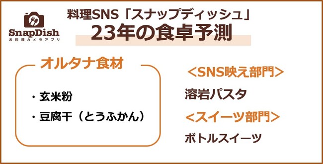 食品値上げラッシュの影響で投稿数が顕著に増えた「アルモンデ」。新たに食材を買って料理をするのではなく、その日「あるもので」工夫して作る料理のことで、2013年に料理SNS「スナップディッシュ」のユーザーが「あるもので、アルモンデ」と称したことから生まれました。一部のユーザーの間で使われていたワードでしたが、22年は投稿数が急増。値上げへの対応を節約や我慢と捉えるのではなく、賢く美味しくアレンジするアイデアのキーワードとして「アルモンデ」という呼び名を得たこと情報交換が楽しまれるようになりました。今年はテレビでも注目され、言われてみればみんな心当たりのある「アルモンデ」。レシピのないの料理ですが、トレンド料理もいくつも生まれてました。