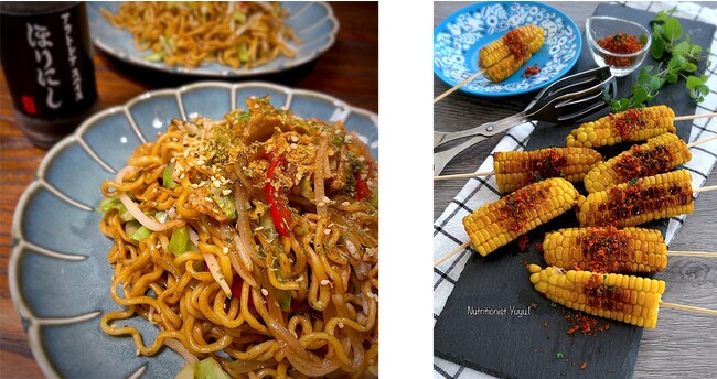 右:フライパン焼きもろこしのスパイスクリスピーがけ(https://snapdish.co/d/4O5iPa)