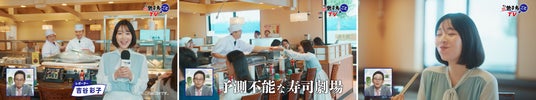 本CMでは、そんな銚子丸での体験を吉谷彩子さんがTV番組風にレポートするのですが…店内のライブなコンテンツに本来のレポート業を忘れてしまうという展開に!どんどんテンションがあがっていく吉谷さんの演技にご注目ください。(※店舗で働くスタッフ全員が銚子丸一座の劇団員であるというコンセプトを掲げております)