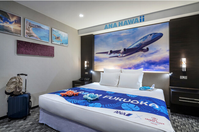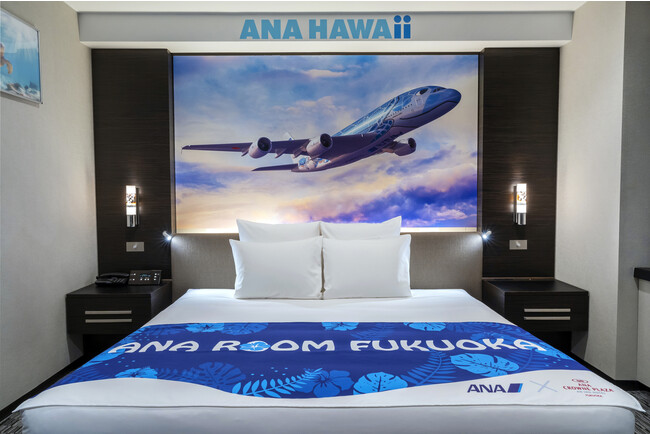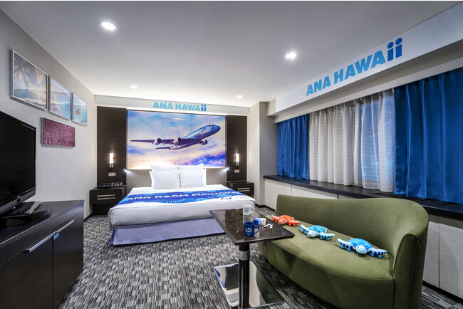 「ANA Hawaii」テーマにエアバスA380型機「FLYING HONU」をモチーフにした装飾を施し、部屋全体をANA一色にしたお部屋です。