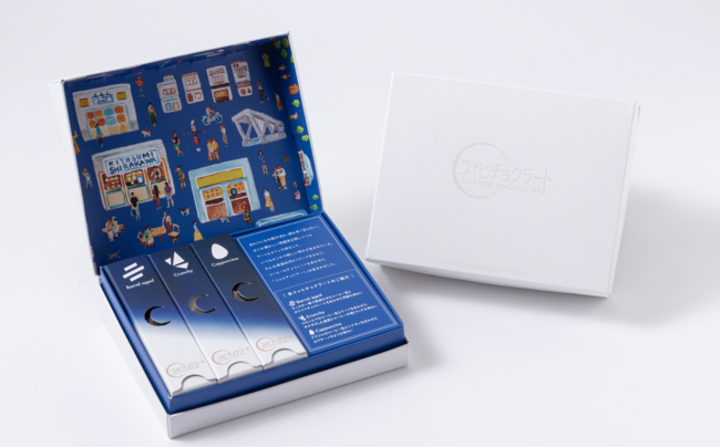 外側は真っ白で、開けると鮮やかな青が目に飛び込んでくるデザインで、開ける前と後のギャップを楽しんでいただけるようにしました。内側にはイワタニユウスケ氏による清澄白河の名所のイラストをあしらっており、清澄白河に思いを馳せながらコォヒチョクラートを召し上がっていただけたらと思います。