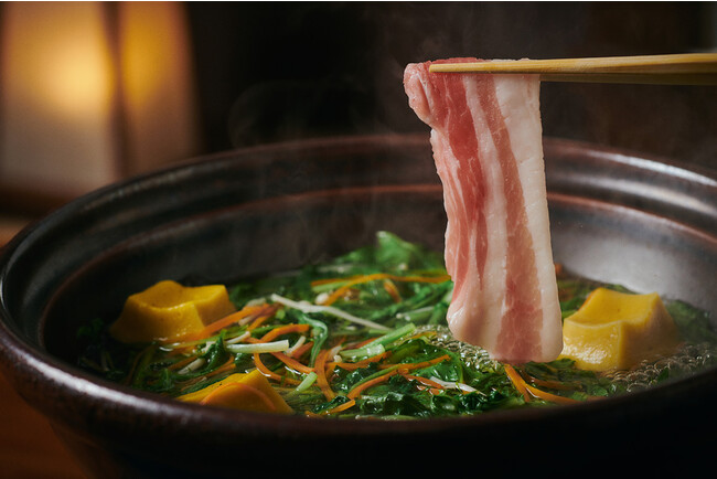 鍋の種類は、しゃぶしゃぶ、すき焼きから二色鍋・薬膳鍋までバラエティーに富んでおり、食材は地産の肥後赤鷄、りんどう豚、小国舞茸や、珍しいうつぼや河豚など、滋養ある食材をふんだんに使っています。