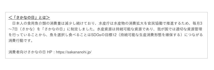 三陸・常磐の水産加工品ECサイト「UMIUMART」を運営する復興水産加工業販路回復促進センターでは、水産庁が制定した、民間企業等における水産物の消費拡大を推進する「さかなの日」(毎月3日から7日まで)に賛同し、「UMIUMART×さかなの日キャンペーン」を実施します。期間中に3,000円(送料・税込)以上お買い上げの方全員、お会計が500円OFFとなります。