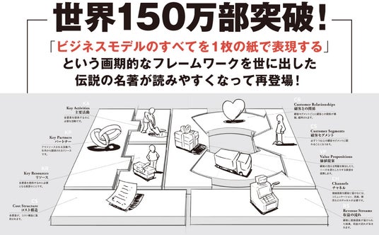 世界で150万部を突破した伝説的な名著が読みやすくなって再登場しました。書籍『ビジネスモデル・ジェネレーション』は、「ビジネスモデル・キャンバス」を用い、顧客セグメントから収益の流れまで、ビジネスを構成する9つの要素を1枚のシートに描き出す画期的なフレームワークを紹介した1冊です。「価値提案」「顧客セグメント」「顧客との関係」「主要活動」「パートナー」「リソース」「コスト構造」「チャネル」「収益の流れ」の9つの要素を書き込めば、顧客のニーズからお金の流れまで、ビジネスモデルの全体像を一目で把握でき、事業の強みや弱み、ボトルネックの発見が可能になります。