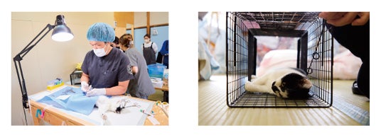 猫保護シェルターでのTNR活動の様子。麻酔で手術待ちの猫(右)