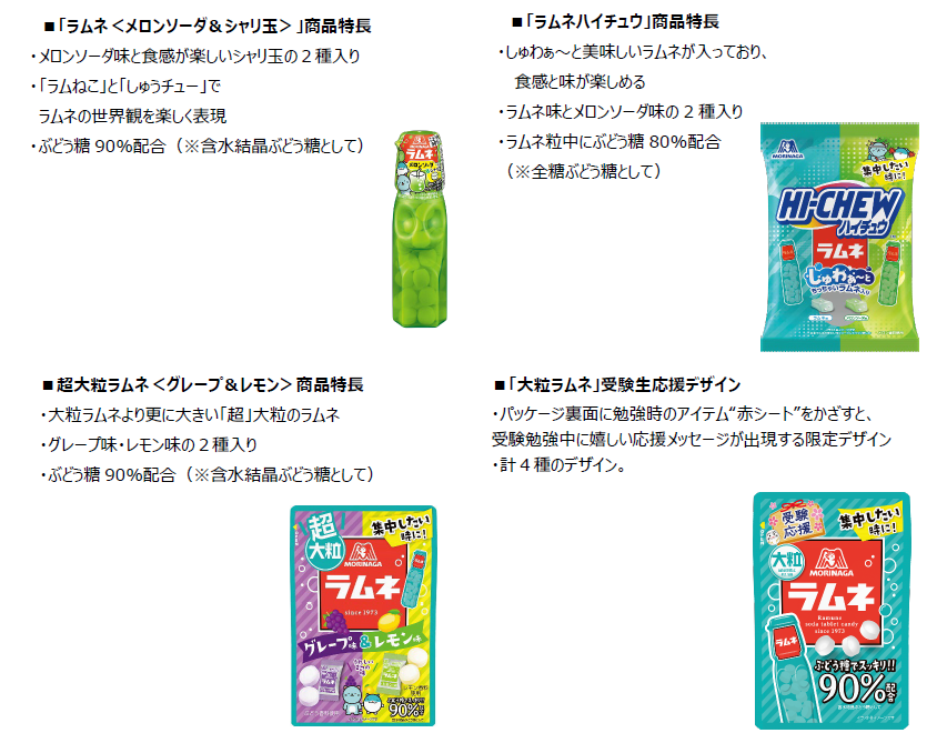 「森永ラムネ」は、おやつだけでなく仕事や勉強で集中したい時・リフレッシュしたい時等、幅広いシーンでお楽しみいただいており、「集中したい時」が多い受験生にもご愛用いただいています。受験勉強の佳境を迎えるこの時期に、「森永ラムネ」シリーズを勉強のお供として、考えるためのエネルギー補給や気分転換にお楽しみいただきたいという思いから発売に至りました。さらに「大粒ラムネ」では、今年も受験生を応援するメッセージが隠されたパッケージの仕掛けがお楽しみいただけます。「森永ラムネ」シリーズにより、受験生を応援するとともに、お客様に笑顔をお届けしてまいります。