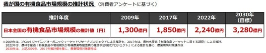 2025年に公開された農林水産省の報告によると、世界を見れば有機食品の市場は北欧諸国を中心に拡大を続けています(図1)。一方で日本は、有機食品を意識的に利用している方は半数未満で、消費額を見ても世界平均以下となっており、まだまだ市場が伸びる可能性を秘めております(図2, 3)。現に、農林水産省の調査では、2009年以降日本全国の有機食品市場規模は拡大を続けており、2030年には3,000億円を超える市場規模にすることが目標として掲げられています(図4)。