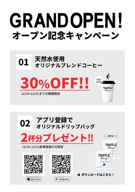 また、オープンを記念して、パンと一緒にお楽しみいただけるコーヒーのキャンペーンを2025年12月10日(水) ~ 12月31日(水)の期間限定で行います。