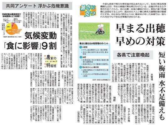 日本農業新聞は、国内唯一の日刊農業専門紙として、気候変動の農業への影響の実態や、対応に苦心する農業者の声を社会に広く発信しています。実践可能な適応策や緩和策を継続的に紹介し、農業者の課題解決に努めています。