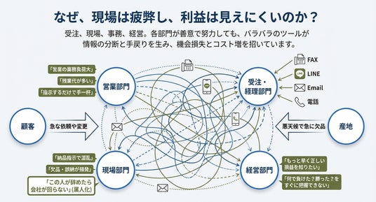 青果の仲卸・食品加工の現場では、FAX・電話・LINEに分散した受注、紙伝票の転記ミス、ロット別在庫の手作業管理が“当たり前”になりがちです。