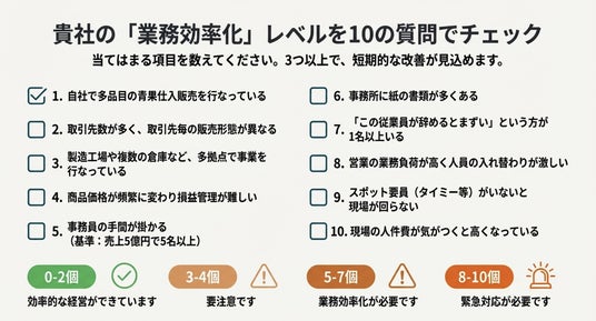 まずは画像のチェックリストを活用いただき、3個以上のチェックがある場合には経営改善効果が期待できますので、ぜひお問い合わせください。