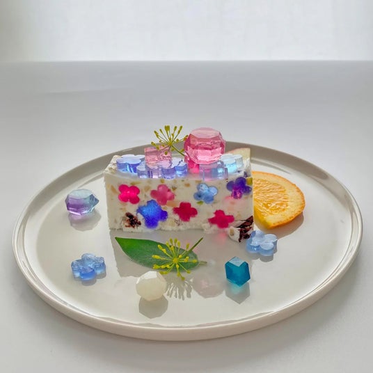 【宝石と紫陽花のカッサータ】の断面。ステンドグラスのように光を通して輝く