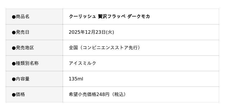 株式会社ロッテ(東京都新宿区、代表取締役社長執行役員:中島英樹)は12月23日(火)に、“飲むアイス”の「クーリッシュ」ブランドから、『クーリッシュ 贅沢フラッペ ダークモカ』を発売します。「お洒落なカフェで出てくるような、贅沢フラッペが楽しめるクーリッシュ」というコンセプトで誕生した、新作クーリッシュです。北海道産生クリームとチョコレートとエスプレッソのコク深い味わいが楽しめるアイスを、微細氷で後味スッキリ楽しむことができます。頑張った一日のご褒美に、ダークモカの味わいが楽しめる“贅沢フラッペ”をお楽しみください。