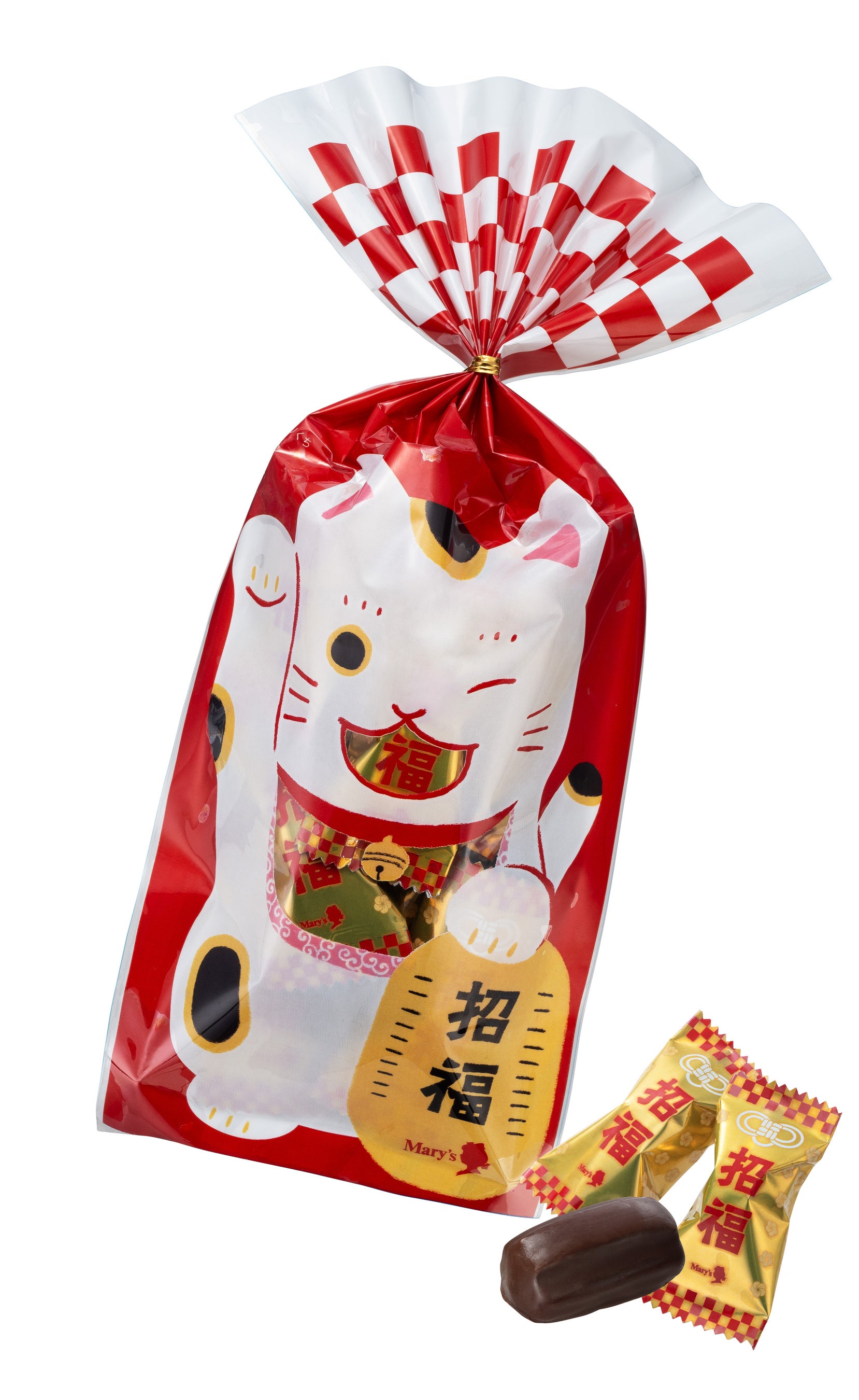 メリーの人気のスイーツタイムシリーズに縁起物登場。チョコレートでコーティングしたクッキーを招き猫イメージのパッケージに詰めました。